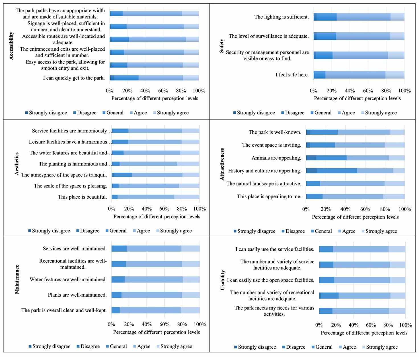 Distribution of respondents' perceptions across the six dimensions of urban parks.